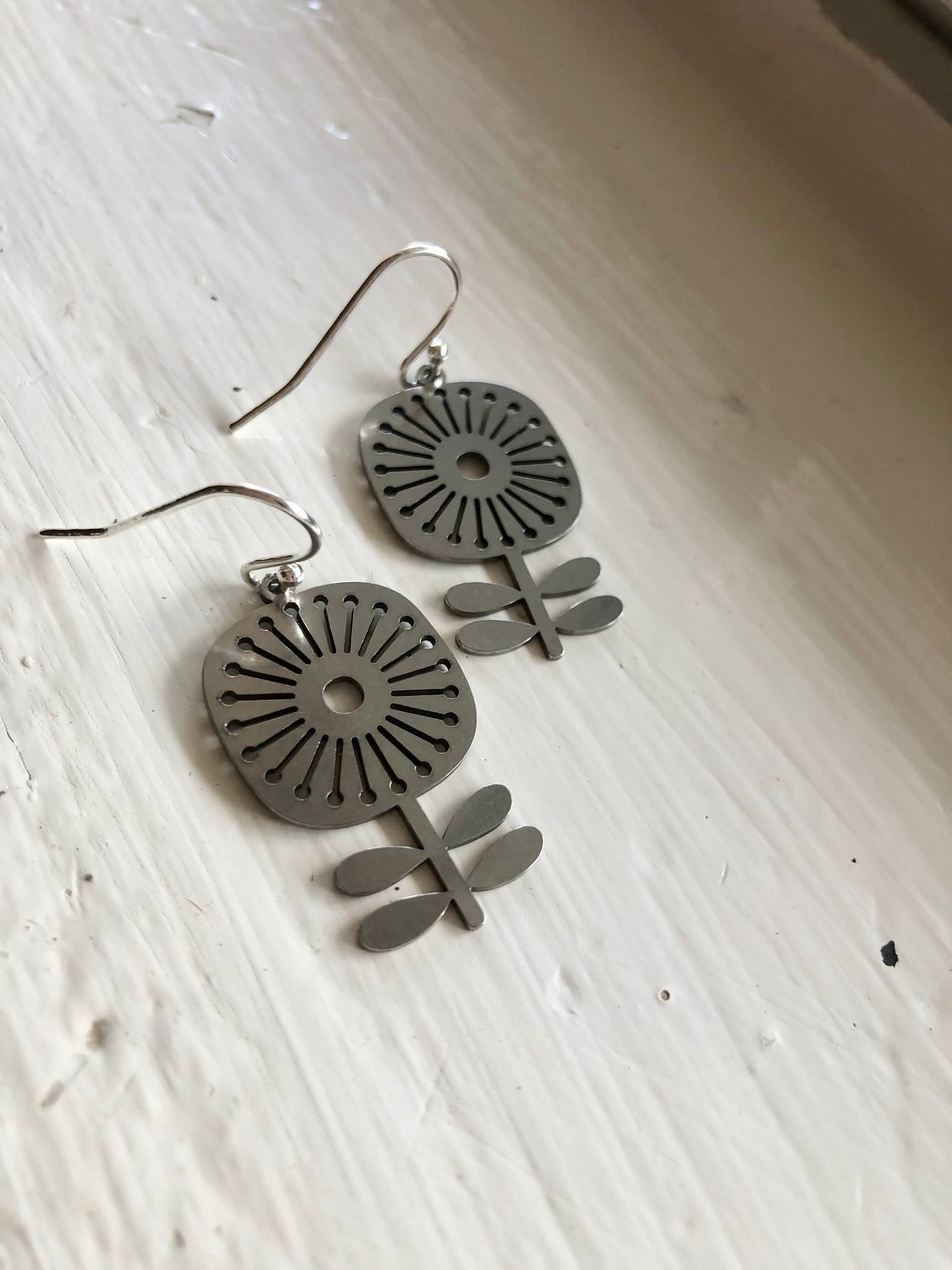 These silver flowers have a mid century modern vibe and are lightweight and fun. Nickel free ear wires